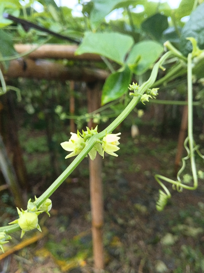 The image presents a close-up, vertical shot of a vibrant green plant vine, identified as a cucurbit species, situated within the city of Kwekwe, Zimbabwe. The central focus is a section of the ribbed green stem, from which multiple small, pale yellow flowers with visible anthers and several spiky, light green spherical buds are emerging. Coiled green tendrils, characteristic of climbing plants, are also observable on the vine. The background is shallowly focused, showing blurred green foliage and indistinct vertical brown elements consistent with wooden stakes or a trellis supporting the plant. The ground directly beneath the vine appears as dark, unfocused soil. No individuals, animals, specific actions, or interactions are depicted in the scene. The lighting is natural, suggesting an outdoor environment.