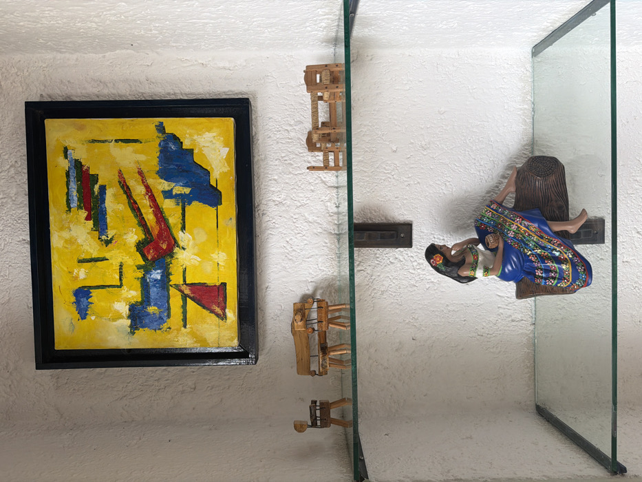 A framed painting with a yellow background and blue, red, and black abstract shapes hangs on a textured white wall. Next to it, a glass display case holds small wooden objects, including a chair. On the right side of the case, a figure of a woman in a blue and floral dress rests against a wooden stump. Both the painting and the glass case are mounted on the wall.