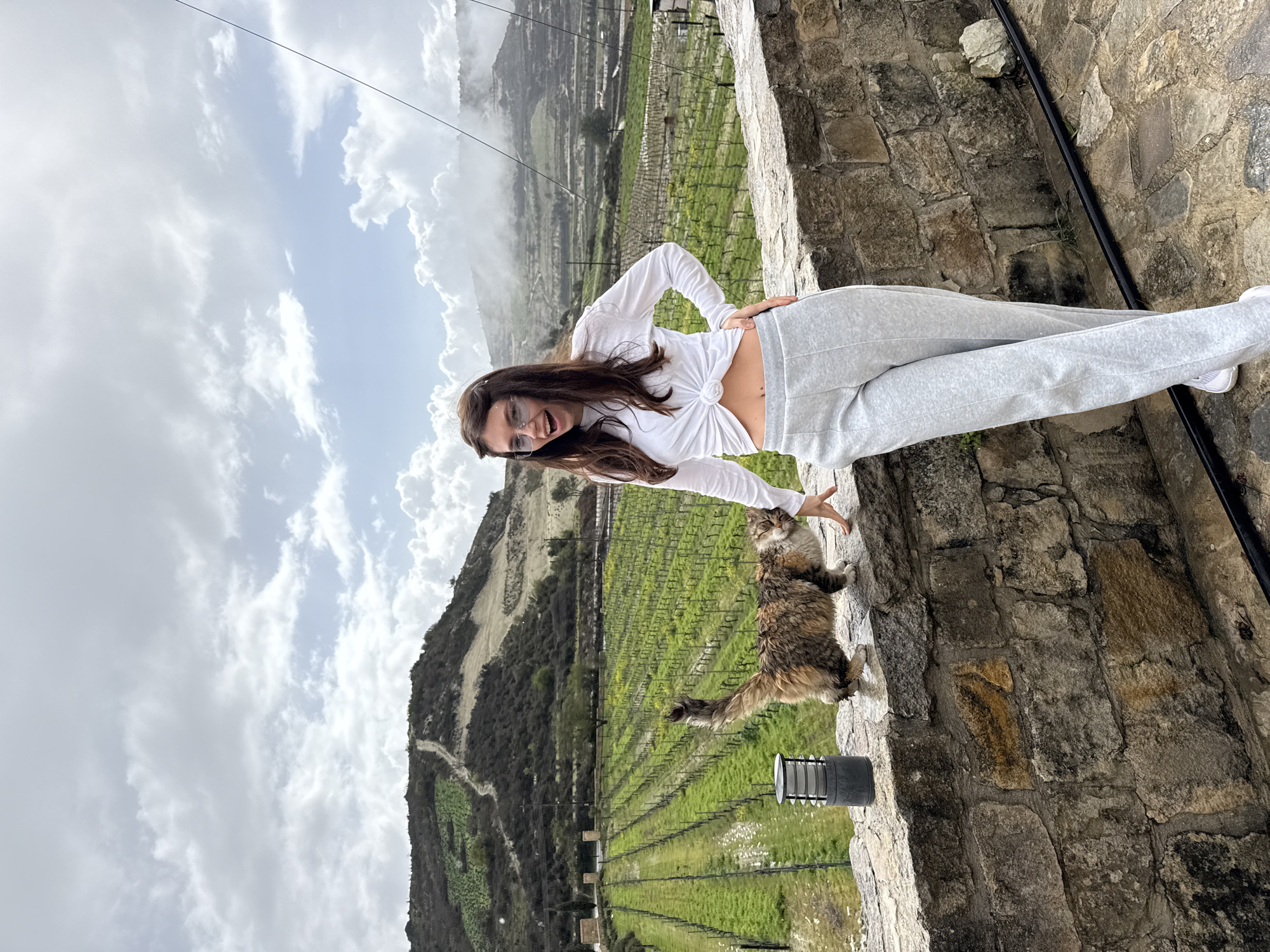 A woman with long brown hair and glasses, wearing a white, long-sleeved shirt tied at the waist and grey sweatpants, poses with a cat on a stone wall. The woman is smiling and extending her hand towards the cat, which is a long-haired, tortoiseshell-colored feline. The scene is outdoors with a vineyard visible in the background. The background includes rolling hills and a cloudy sky. The location is likely in the village of Omodos, Cyprus. A black metal railing is attached to the stone wall next to the woman. A light post sits next to the cat.
