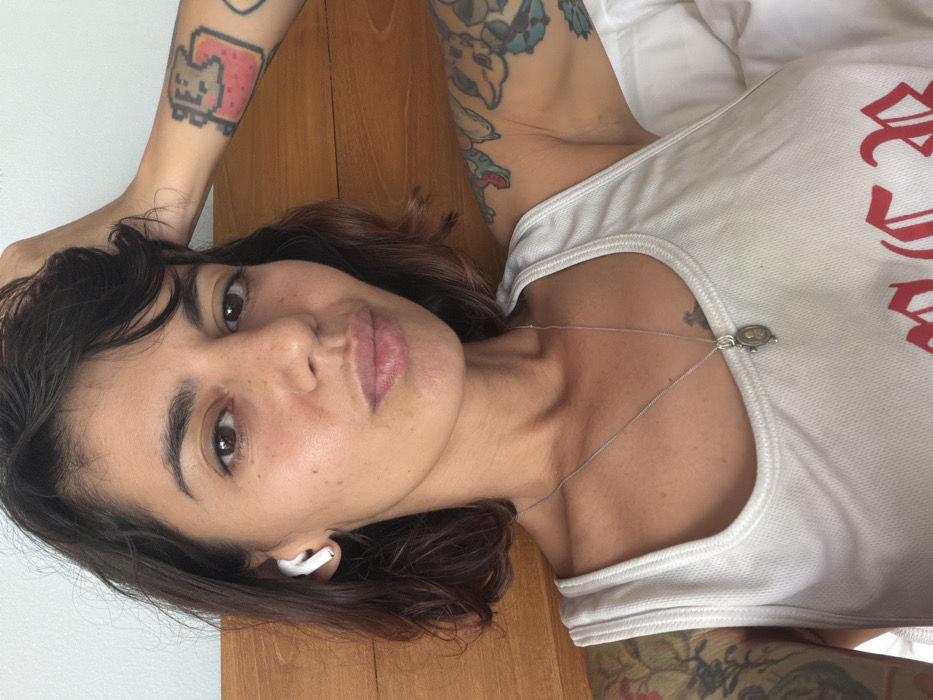 A woman with dark, wavy, short hair is depicted in a close-up, head-and-shoulders shot, looking directly at the camera. She has brown eyes and full lips, slightly parted. A white AirPod Pro is in her left ear. Her right hand is positioned behind her head, with fingers visible in her hair. She wears a white tank top with a partial red gothic-style inscription on the chest. A thin silver chain necklace with a small, oval-shaped silver pendant hangs around her neck. Multiple tattoos are visible on both arms: the left arm displays a pixelated red and pink strawberry tart-like design, along with other dark, organic patterns. The right arm features colorful tattoos, including a green serpentine creature with red eyes and blue scales amidst floral motifs. The background consists of a light brown wooden headboard or panel and a plain light-colored wall. A white sheet or blanket is visible in the lower right corner, suggesting she is reclining in a bed. The specific location within Nusa Dua, Indonesia, is not visually discernible from the image.