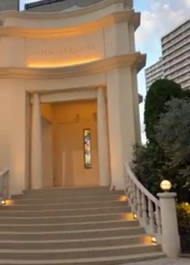 exterior of a building with the word "ANNIVERSAIRE" above the entrance. The building is light-colored with a classical design, featuring columns and a staircase leading to the entrance. There's a stained-glass window visible near the door. The surrounding area is decorated with trees, bushes, and ornate light fixtures. Above the walkway are strings of globe-shaped lights. The video also captures a building with a spire in the background and flags bearing the "ANNIVERSAIRE" logo. The sky is visible in the background.