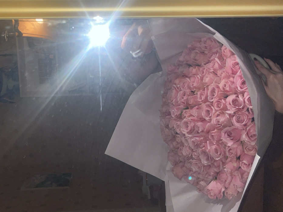 The image displays a large bouquet of pink roses, held by an individual, captured via reflection in a mirror