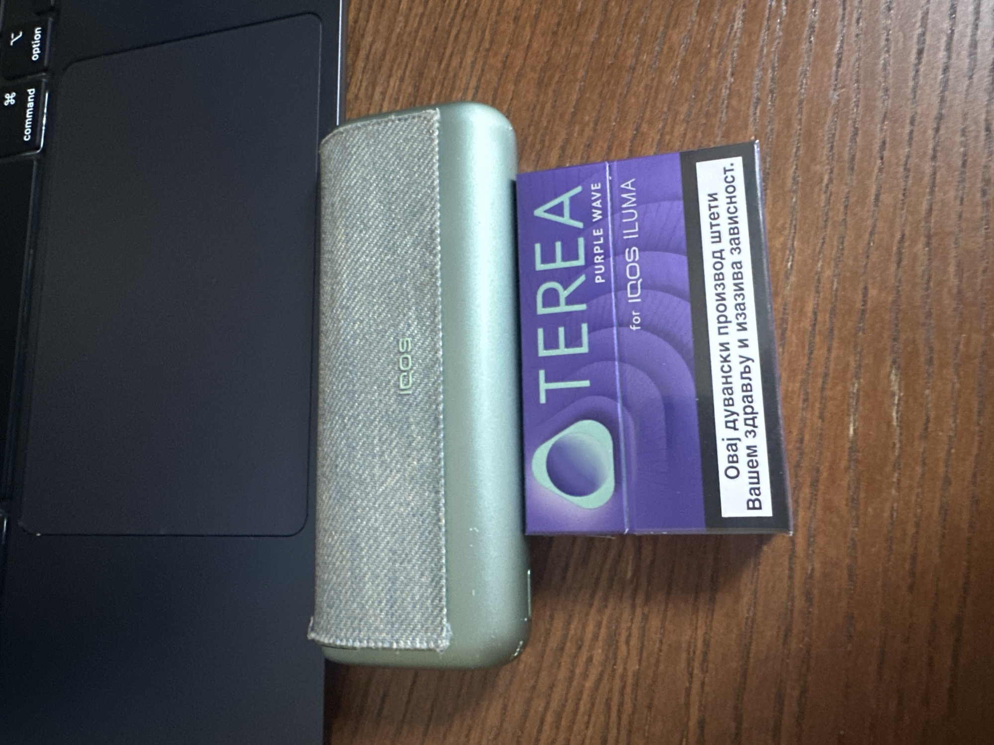 purple pack of Terea Purple Wave for IQOS Iluma cigarettes on a wooden surface. Beside the pack, there is an IQOS device with a gray textile-like cover. A black laptop with the "command" and "option" keys visible is also present. The scene appears to be indoors on a wooden table. It is not possible to determine the location in Budapest, Hungary from the image.