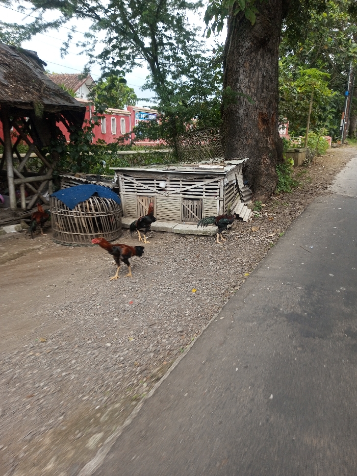 The scene depicts an outdoor environment in Khajuripada, India, featuring a gravel area adjacent to an asphalt road. On the left, a thatched-roof structure with bamboo supports is partially visible. In the foreground and midground, four roosters are present on the gravel: one dark brown and black rooster with a red comb walks from left to right; another black and red rooster stands near a small, round bamboo cage covered with a blue fabric; a third rooster with black and iridescent green plumage stands near a white wooden coop; and a fourth dark-feathered rooster stands close to the entrance of the coop. The white wooden coop, constructed with slatted sides and multiple compartments, is situated beneath a large tree trunk. This coop features a corrugated metal roof. To the right of the gravel path, a dark asphalt road extends into the distance. In the background, green foliage and trees are visible, along with distant buildings, including a prominent reddish-orange structure with white-framed windows and a partially visible building with a blue sign. The sky is overcast.