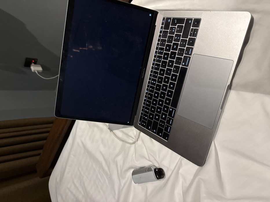 An open MacBook Pro dominates the scene. Its silver keyboard and trackpad are visible. The screen, primarily dark, reflects some light. A small, gray electronic device rests on the white, slightly wrinkled bedsheet beneath the laptop. A charging cable runs from the laptop to a wall outlet in the background, positioned near a wooden structure. The overall lighting is soft.