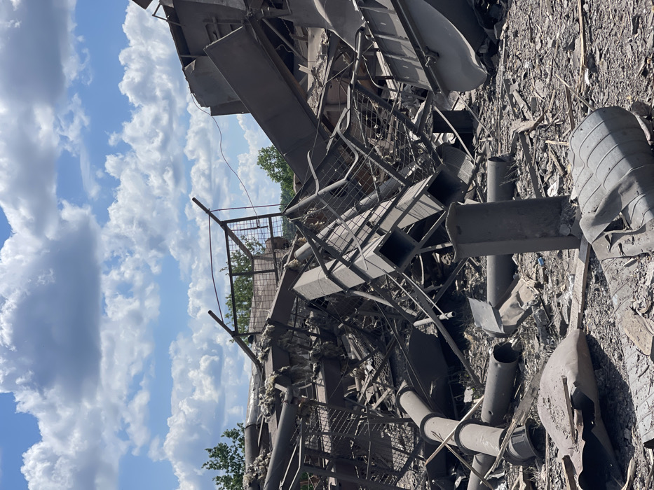 scene of destruction in Terny, Ukraine. The location is a site of a destroyed building, likely an industrial facility, with rubble scattered across the ground. The site contains large pieces of metal, twisted beams, and other debris, suggesting an explosive event. There are no visible people in the image. The debris is lying on a field of dry, cracked earth and dirt, with green foliage in the background. The sky is blue with white clouds.