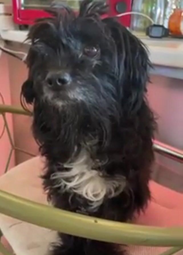 A small, long-haired black dog with white markings on its chest is sitting on a chair
