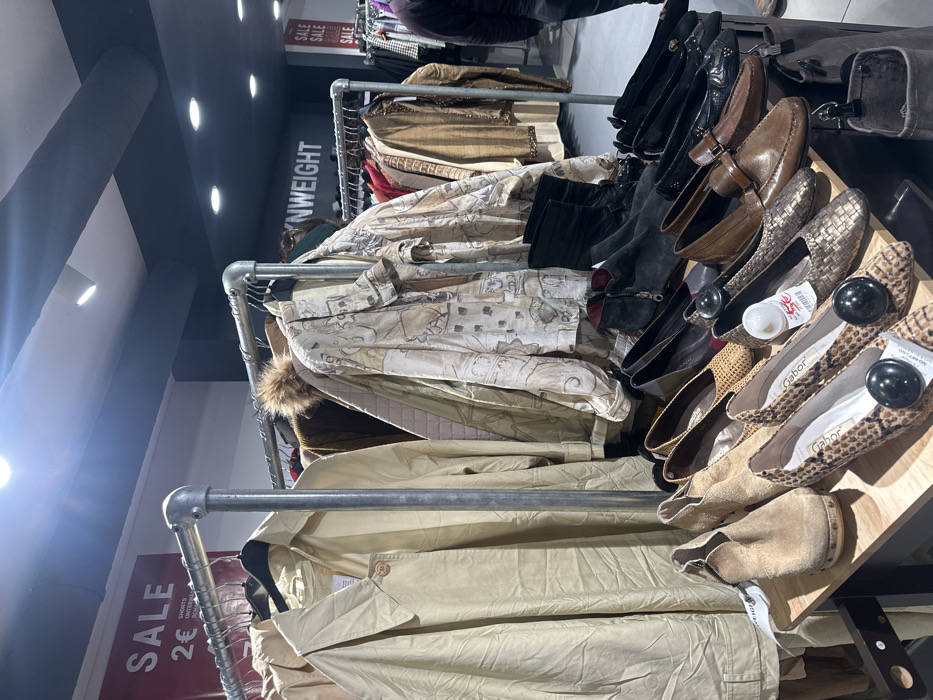clothing store located in Heidelberg, Germany (latitude: 49.41, longitude: 8.696). The store is well-lit with white walls and a high ceiling. There are racks of clothing on both sides of the room, with various items such as jackets, coats, shirts, and dresses. The store has a sign that says "SALE 2€" above the rack on the left side of the room. Another sign above the rack on the right side of the room says "NWEIGHT" above the clothing. The store has wooden floors and a wooden table in the center, where there are several pairs of shoes and boots. There are a few people in the store, but only the lower portion of their bodies can be seen. It is unclear what they are doing.