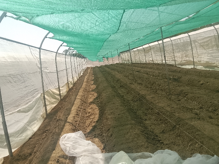 The image depicts the interior of an agricultural shade house located in Jos, Nigeria. The structure consists of curved metal frames supporting an overhead green mesh shade netting, which exhibits some tearing or displacement. The side walls are covered with a white, translucent fabric material. The ground inside is organized into multiple parallel rows of dark, tilled soil, configured as planting beds. Lighter, sandy soil forms paths between these beds and along the perimeter. Thin white lines, possibly marking strings or drip irrigation tubing, traverse the prepared soil rows. In the immediate foreground, crumpled piles of the same white, translucent fabric observed on the walls are present on the sandy ground. No individuals are visible within the scene. The environment is brightly illuminated by direct sunlight penetrating the structure.