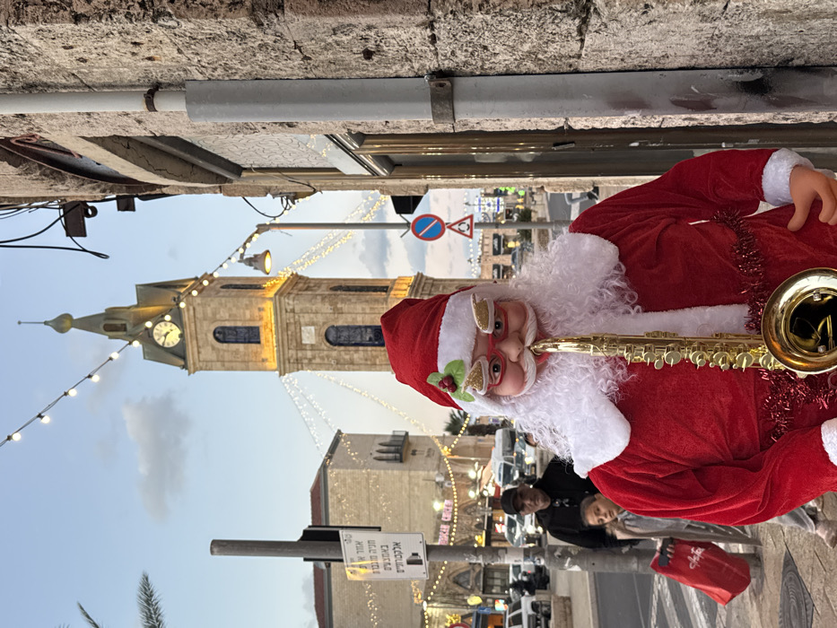 The image depicts a festive street scene in Jaffa (Yafo), Tel-Aviv, Israel, specifically near the Jaffa Clock Tower, visible prominently in the background. In the foreground, a static display or individual dressed as Santa Claus stands on what appears to be a sidewalk or plaza. The Santa figure wears a red velvet suit with white trim, a red hat adorned with green holly and red berries, and a white curly beard and mustache. It has a pink face, red-framed glasses with gold glitter eyebrow accents, and is holding a golden saxophone vertically, positioned as if being played. Red tinsel is wrapped around the Santa figure's waist. To the left and slightly behind the Santa figure, a man in a dark cap and dark jacket is partially visible, observing the scene or passing by. Next to him, a child, likely a girl with light brown hair, wears a light-colored long-sleeved top and holds a red shopping bag with white text. The background features the iconic Jaffa Clock Tower, a tall, light-colored stone structure with arched windows, a clock face displaying approximately 5:30, and a pointed spire. The tower is illuminated with warm yellow lights. String lights are draped across the street and between buildings, adding to the festive atmosphere. Older, stone-built buildings line the street, some with arched entrances. Numerous vehicles, including cars and vans, are visible on the street. Various street signs are present, including a white sign with Hebrew text and black symbols on a pole to the left, and a "No Entry" sign (red circle with white bar) and a "Pedestrian Crossing" warning sign (triangle with pedestrian symbol) further down the road. The sky is light blue with some scattered clouds, indicating late afternoon or early evening.