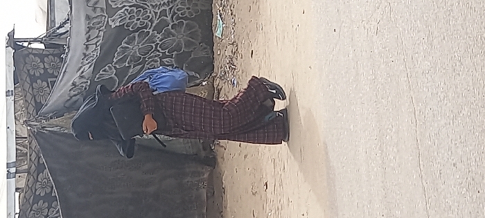 In Khan Yunis, Palestinian Territory, an individual walks rightward on a light-colored paved surface. The person is wearing a black niqab, a black head covering, and a long, loose-fitting garment with a red and dark plaid pattern. A black laptop-like device is held in the left arm, and a blue backpack is worn on the back. The right foot wears a black open-toe sandal with a white "7" emblem on the strap. The background features a makeshift structure constructed from dark fabric or tarpaulins, displaying a repeating light-colored floral pattern. Scattered debris is visible on the unpaved ground adjacent to the paved surface.