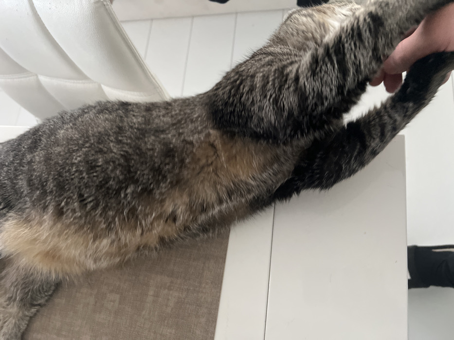 The image depicts an indoor scene within a domestic setting, likely a private residence in Izhevsk, Russia, though no specific external identifiers for precise location are visible. The central subject is a domestic short-haired tabby cat, exhibiting a coat pattern of dark grey, brown, and light beige stripes. The cat is lying in a supine or partially inverted position on a smooth, white surface, consistent with a table or countertop. Adjacent to the cat's upper body, a beige, textured surface, possibly a rug or fabric upholstery, is visible. In the lower right corner, a human hand, appearing to be an adult's, is gently grasping or caressing the cat's posterior left paw or lower leg. A portion of a white, tufted, upholstered chair is visible in the upper right background. The environment appears brightly lit and uncluttered.