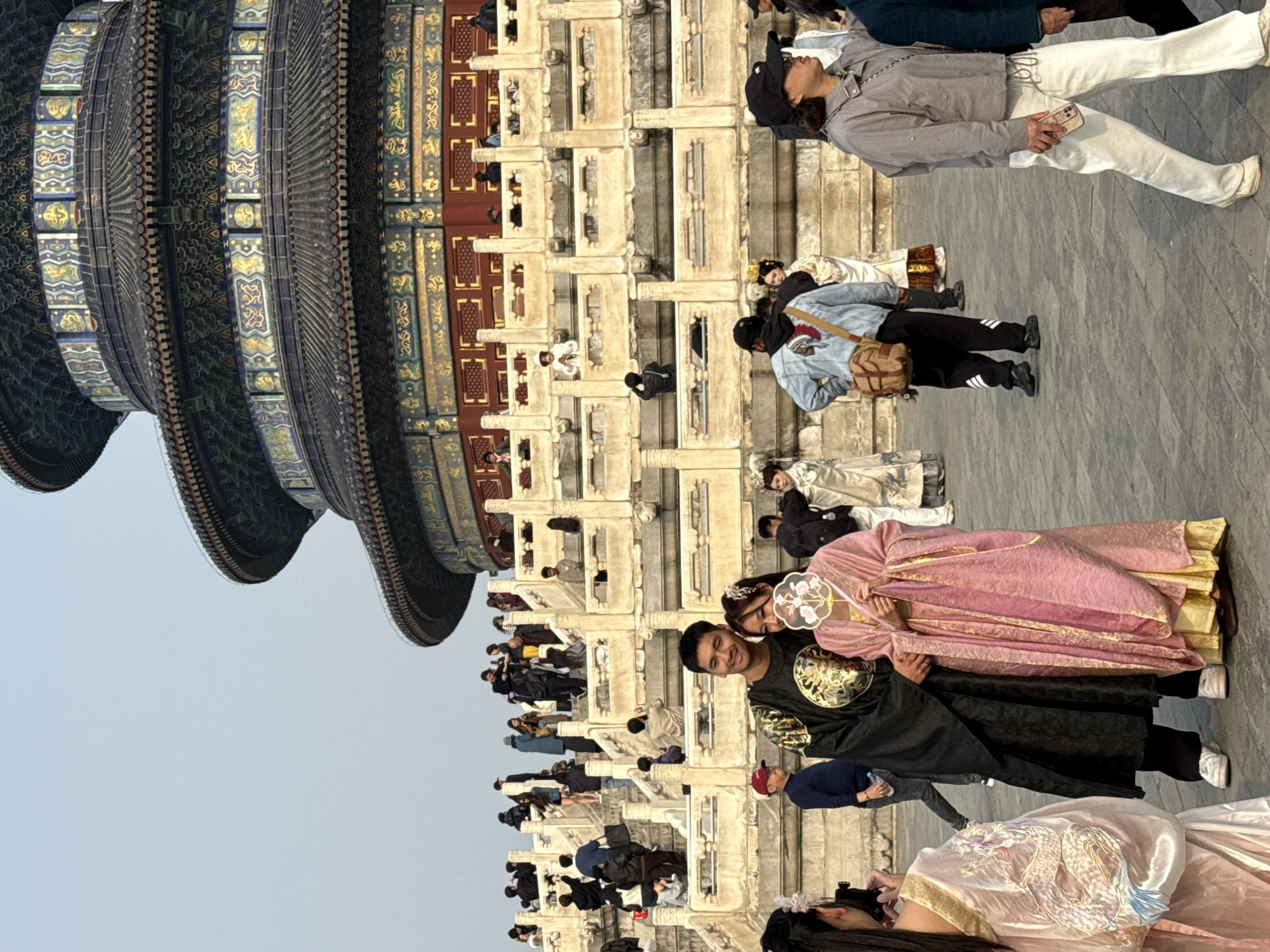 The image depicts an outdoor scene at the Hall of Prayer for Good Harvests within the Temple of Heaven complex, located in Dongcheng District, Beijing, China. In the immediate foreground, a man and a woman are posed. The man wears a black traditional Chinese robe with gold circular embroidery, black pants, and white sneakers, with his arm around the woman's shoulder. The woman wears a pink traditional Chinese robe over a yellow undergarment, her hair styled with an ornament, and holds a white circular fan with a floral design. To their left, partially visible with her back to the viewer, another person in a light pink traditional gown with white and gold embroidery photographs them with a dark smartphone. The background is dominated by the Hall of Prayer for Good Harvests, a multi-tiered circular structure with dark blue tiled roofs, intricate gold and colorful decorative patterns on its eaves, and red lower walls. It stands on a multi-level white marble platform featuring balustrades and staircases. Numerous individuals, dressed in both traditional Chinese attire (including white, cream, and gold robes) and contemporary clothing, are present on the paved light gray stone plaza and across the temple's marble base, some ascending or descending stairs. On the right side of the frame, a woman in a black baseball cap, sunglasses, a grey jacket, and white pants walks left, holding a light pink smartphone. The sky overhead is clear and pale blue. The scene is moderately crowded under bright daylight conditions.