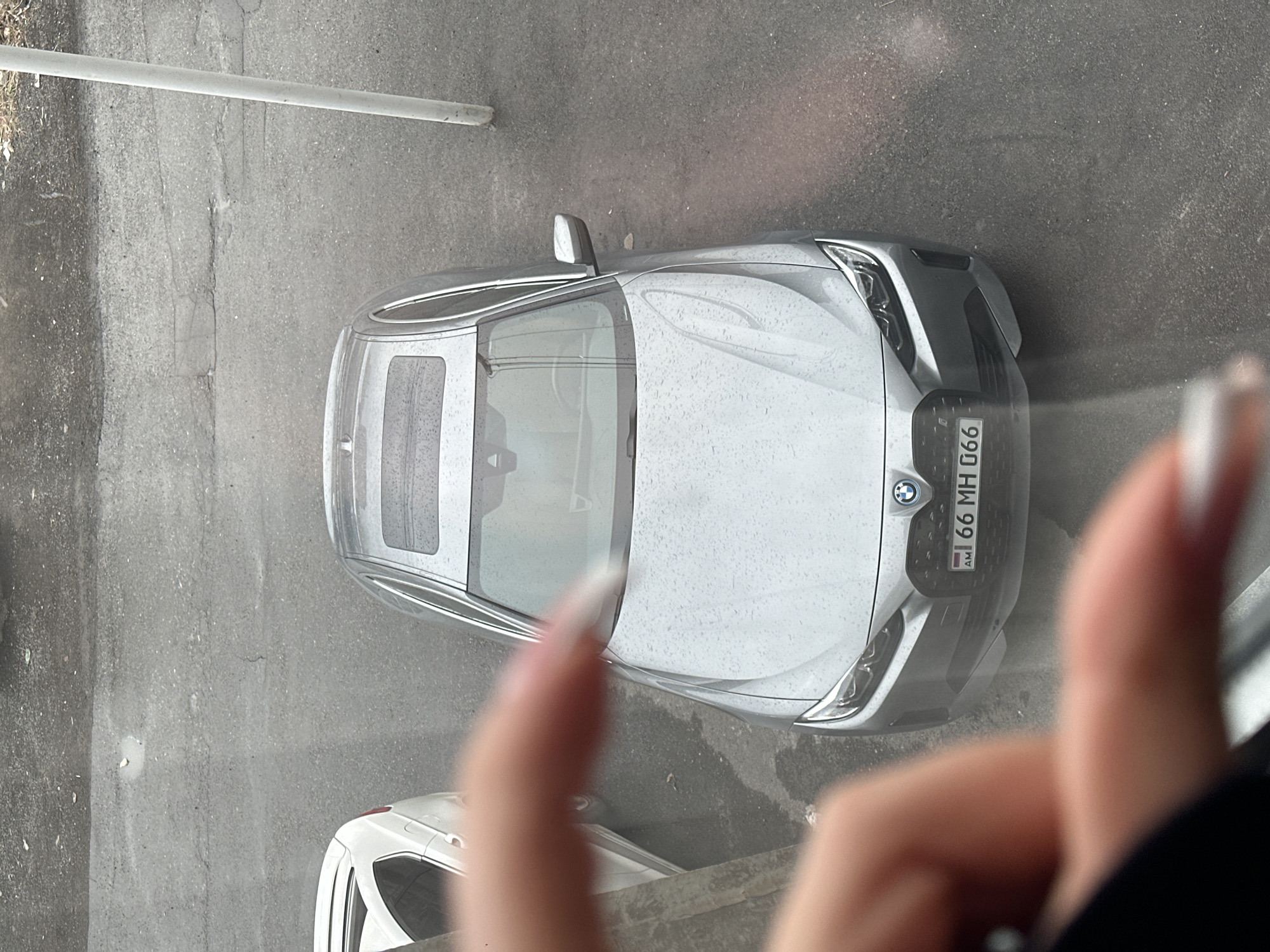 The image depicts an overhead view of a street scene in Zovuni, Armenia. A silver-grey BMW i4 sedan is parked centrally on asphalt pavement. The vehicle's front license plate, "AM 66 MH 066", is clearly visible. Both the car's exterior and the pavement are covered in numerous small water droplets, indicating recent precipitation. To the left, a portion of a white sedan is visible, parked alongside the BMW. A slender white pole stands vertically near the right edge of the frame. The immediate foreground is heavily blurred by a human hand, specifically two fingers with elongated, light-colored manicured fingernails, obstructing the lower-left section of the view. The photograph appears to have been taken from an elevated position, likely from a window.