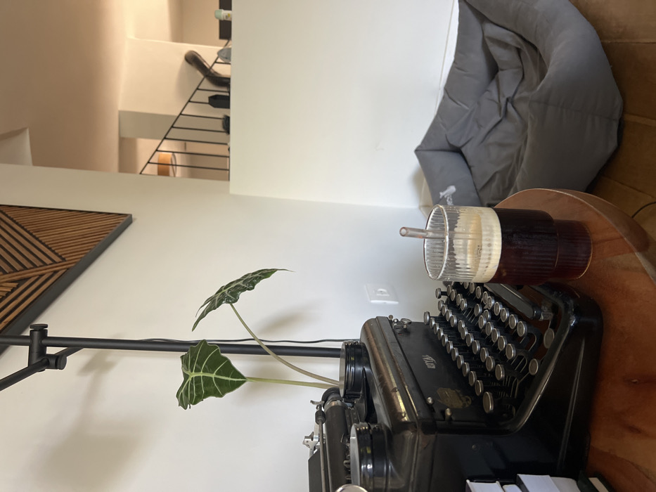 The image depicts a static indoor scene within a residence, located in Kadima, Israel. The foreground features a light-colored wooden table on the left, holding several items. A vintage black "ROYAL" brand typewriter is centrally positioned on the table, with two small black circular containers resting on its top surface. To the right of the typewriter, a clear, ribbed glass containing a dark liquid, possibly iced coffee, with a layer of light foam on top and a clear straw, stands on the table. Behind the typewriter, a small houseplant with two large, dark green, arrowhead-shaped leaves featuring prominent white veins is visible, seemingly in a black pot. Extending vertically behind the plant is a thin, black pole, part of a floor lamp. The background consists primarily of white walls. A white electrical outlet is visible on the wall behind the typewriter. Above the lamp and plant, a large, rectangular piece of wall art with a geometric pattern composed of light-colored wooden slats on a dark background is mounted. To the right of the table, on a light wood floor, rests an empty, grey pet bed with raised edges. Further into the background, beyond a white half-wall, a multi-level interior space is visible, featuring a black metal staircase railing and partially obscured objects on a landing. No individuals are present, and no active interactions or movements are depicted.