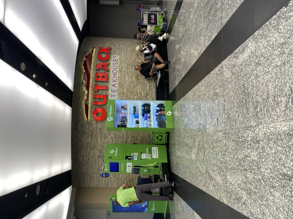 The scene depicts an interior view of a commercial area within Aeropuerto Internacional Ezeiza, Argentina. The floor is composed of large, light grey speckled granite tiles with two parallel dark grey-black stripes running horizontally across the midground. The background features a curved wall clad in textured, natural-toned stone veneer, predominantly tan and brown hues. Mounted centrally on this wall is a large, illuminated sign for "OUTBACK STEAKHOUSE®" with prominent red lettering outlined in dark red, topped by a red and orange mountain-like logo. The ceiling above is modern, featuring large rectangular white light panels interspersed with dark, recessed sections. To the left of the image, a male individual is present, seen from behind, wearing a bright green short-sleeved shirt with a white logo and dark grey trousers. He is bent forward, actively interacting with or servicing a tall, multi-part green kiosk labeled "tripstore." This kiosk includes a section with a blue screen and another displaying a recycling symbol. Adjacent to this, to the right, stands a tall, narrow, illuminated green display case, also labeled "tripstore," showcasing various small electronic devices and accessories on multiple shelves. To the right, three individuals are seated on a dark metal bench. The closest, an adult male, wears a dark t-shirt and shorts, holding a small dark object in his raised right hand. Next to him, an individual in a white baseball cap, dark top, and light pants is looking down at a personal device. Partially obscured at the far right of the bench is a third individual in a striped shirt. A silver-colored luggage cart with "LG" branding is positioned next to the seated individuals on the far right. No direct interaction is observed between the individual servicing the kiosk and the seated group.