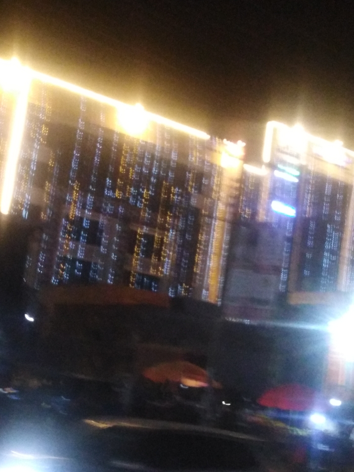 A blurry, low-light image shows a building at night adorned with strings of lights, creating a festive atmosphere. The lights appear as streaks of yellow and blue. Below the building, two red umbrellas stand out amidst the darkness and other indistinct shapes, potentially indicating a street market or gathering. The overall image is hazy, likely due to motion blur or a poorly focused camera.