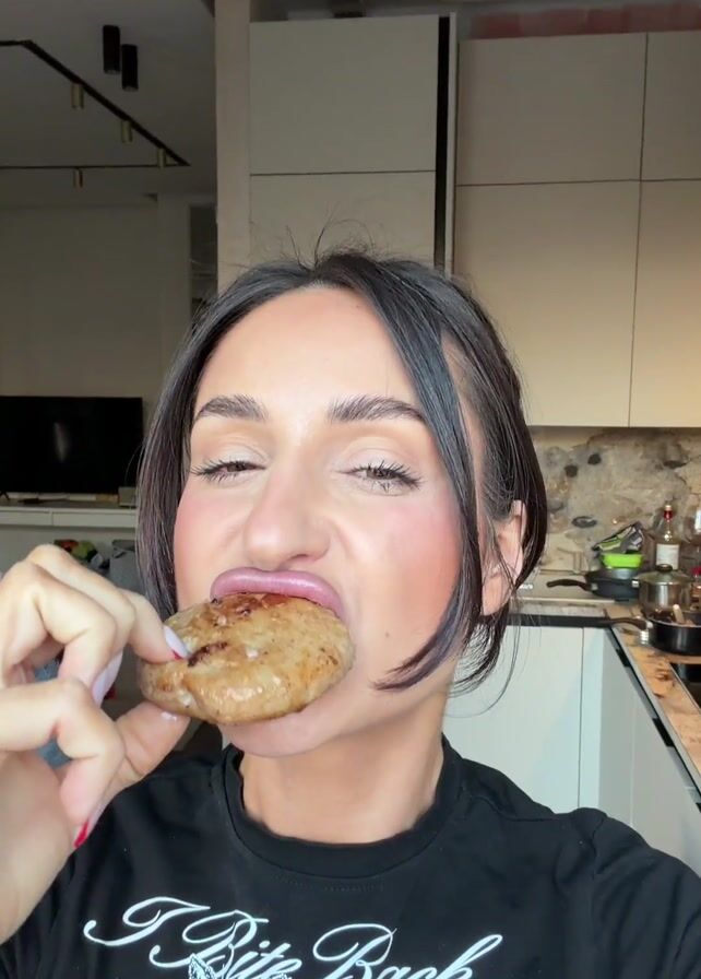 A woman is holding a piece of food in her hand and biting into it. She is wearing a black t-shirt with a graphic print and has dark hair and fair skin. She is standing in a kitchen with white cabinets and a marble countertop. In the background, a person is visible in the living room and is not interacting with the woman. The lighting in the kitchen is bright and even. The woman appears to be enjoying the food.