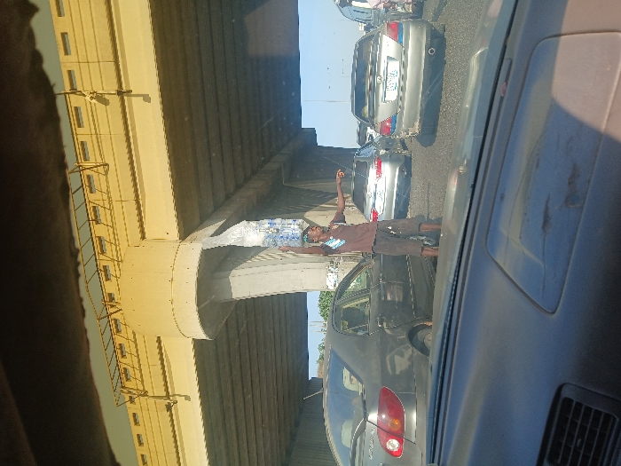 A man stands between cars under an overpass, balancing a stack of water bottles on his head with arms raised. The scene appears to be taken from inside a car, as part of a dashboard is visible. Traffic is visible behind him. The bridge overhead casts a shadow on the road.