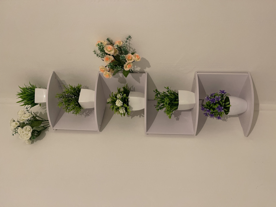 The image displays an indoor corner of a room with plain white walls. The precise location within Strasbourg, France, is not discernible from the visual information provided. A white, five-tiered, zig-zag corner shelving unit is vertically mounted in the corner. Each of the five shelves supports a single potted artificial plant in a white container. Arranged from top to bottom: 1. The uppermost shelf holds a small white pot containing green artificial grass. To the left of this shelf, a cluster of artificial white roses is affixed directly to the wall. 2. The second shelf down contains a small white pot with a green artificial shrub-like plant. 3. The third shelf down features a small white pot with a green artificial plant exhibiting small white flowers. To the right of this shelf, a cluster of artificial peach-colored roses is attached directly to the wall. 4. The fourth shelf down holds a small white pot with a green artificial shrub-like plant. 5. The bottom shelf displays a small white pot with artificial purple flowers. No individuals are present. The scene is static, devoid of discernible actions or interactions.