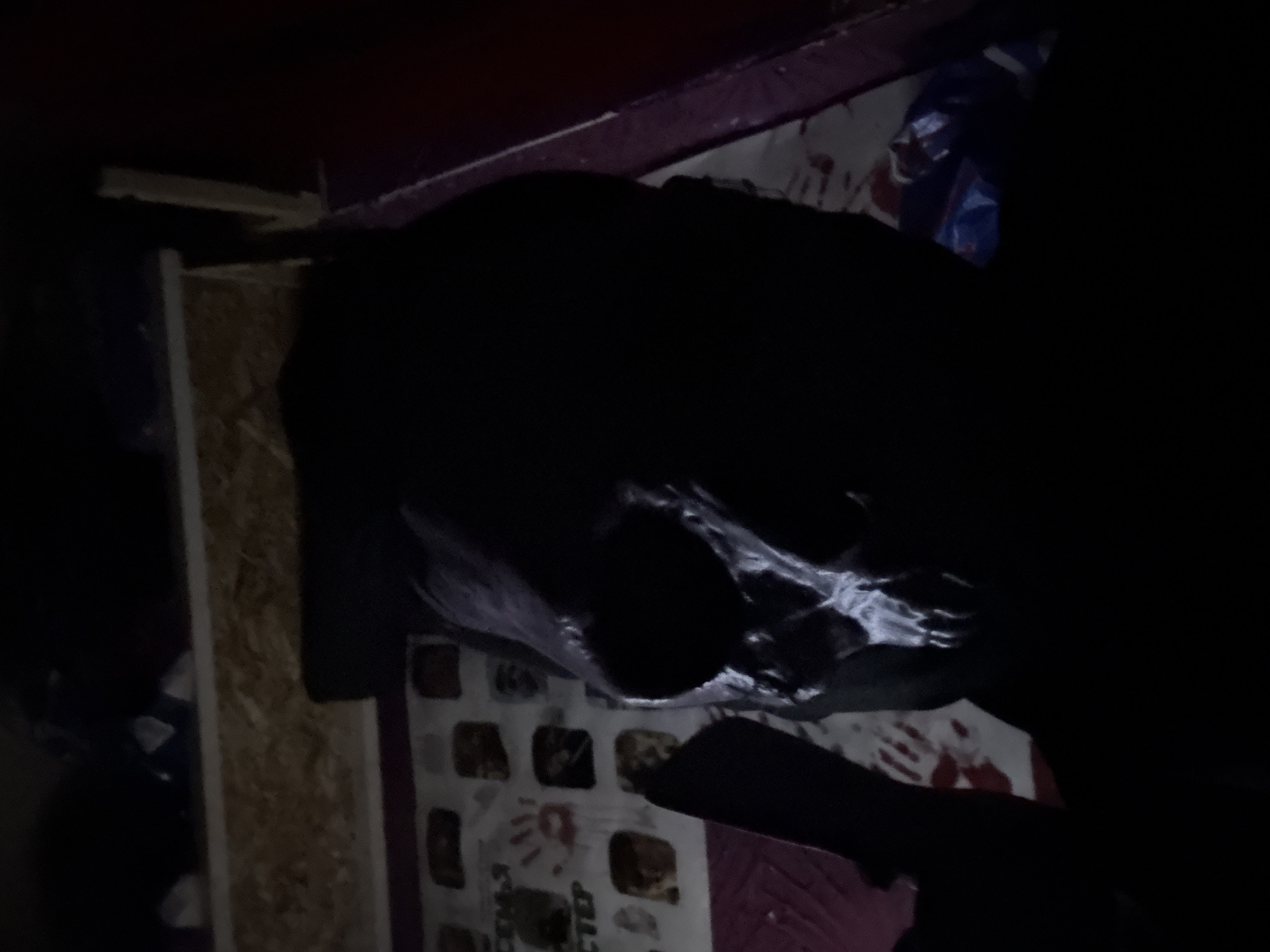 dimly lit interior space. There is a black, amorphous object taking up much of the frame. Behind this object, there is a wall with a patterned covering that includes what appears to be handprints. A wooden panel is also visible on the left side of the frame. It is difficult to determine the precise location or any specific interactions. There is insufficient information to identify the location as Saratov, Russia.