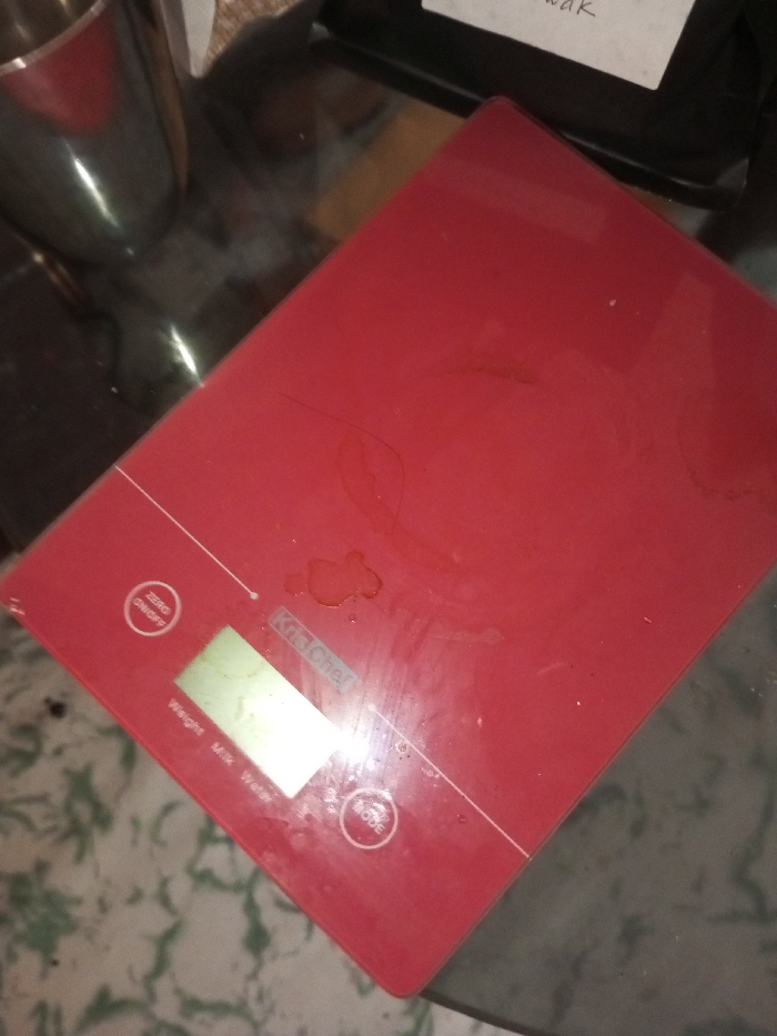 A red digital kitchen scale sits on a reflective surface. It's rectangular with rounded corners and shows buttons labeled "zero/on/off", "Weight Milk Water", and "Mode". The display screen is visible. The brand name "Kris Chef" is printed on the scale. There are several splotches and streaks of liquid on the surface, suggesting spills. A stainless steel object sits to the left of the scale, and a bag with writing on it is to the upper right.