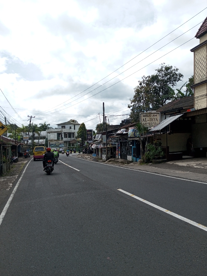 The scene depicts a street in the city of Taohom, Laos, under an overcast sky. A two-lane asphalt road, marked with a solid white line on the left shoulder and a dashed white center line, curves gently to the right in the distance. In the left lane, a person on a black motorcycle wearing a red helmet and dark jacket is moving away from the viewer, followed by another person on a motorcycle in a green helmet, and a yellow van further back. Additional motorcycles are visible in the distance. Along the right side of the road, a series of single-story buildings with corrugated metal roofs house various small businesses or residences. A prominent sign identifies "MASJID JAM AL-IHYA", with additional text visible below it including "JL. RAYA..." and "MALANG". Beyond these structures, a multi-story building with a textured facade rises, possibly part of the mosque complex. Utility poles with numerous overhead wires line both sides of the road. On the left side, a dirt shoulder holds several parked motorcycles, and a partial yellow directional arrow sign is visible. Further down the street on the left, a multi-story white building with green accents and dense tropical foliage are present. The environment appears to be an active urban or semi-urban area.
