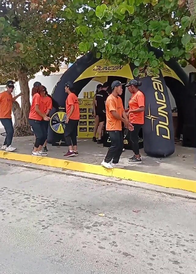 group of people standing near a black and yellow promotional tent with the brand name “DUNCAN” written on it. Most of the people are wearing bright orange T-shirts with the text “TEAM ANIMATE” printed on the back. There is a yellow spinning wheel next to the tent. Some of the people are interacting with each other while others appear to be watching someone spin the wheel. The tent is located on a sidewalk next to a street and a tree provides shade for the area. A speaker is located near the tent.
