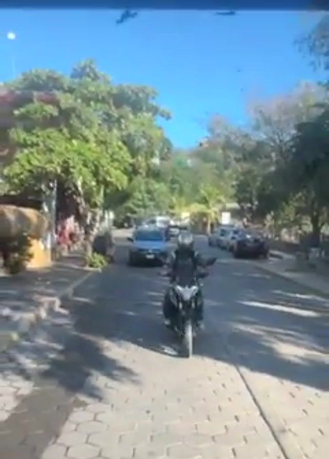 A first-person perspective video shows a motorcyclist riding down a street lined with trees and buildings. The motorcyclist is wearing a helmet and riding on a black and green motorcycle. The street is paved with stone and there are cars parked along the side of the road. In the background, there is a hill with buildings on top. The sky is blue and clear. The video appears to be taken from a moving vehicle, possibly a bus.