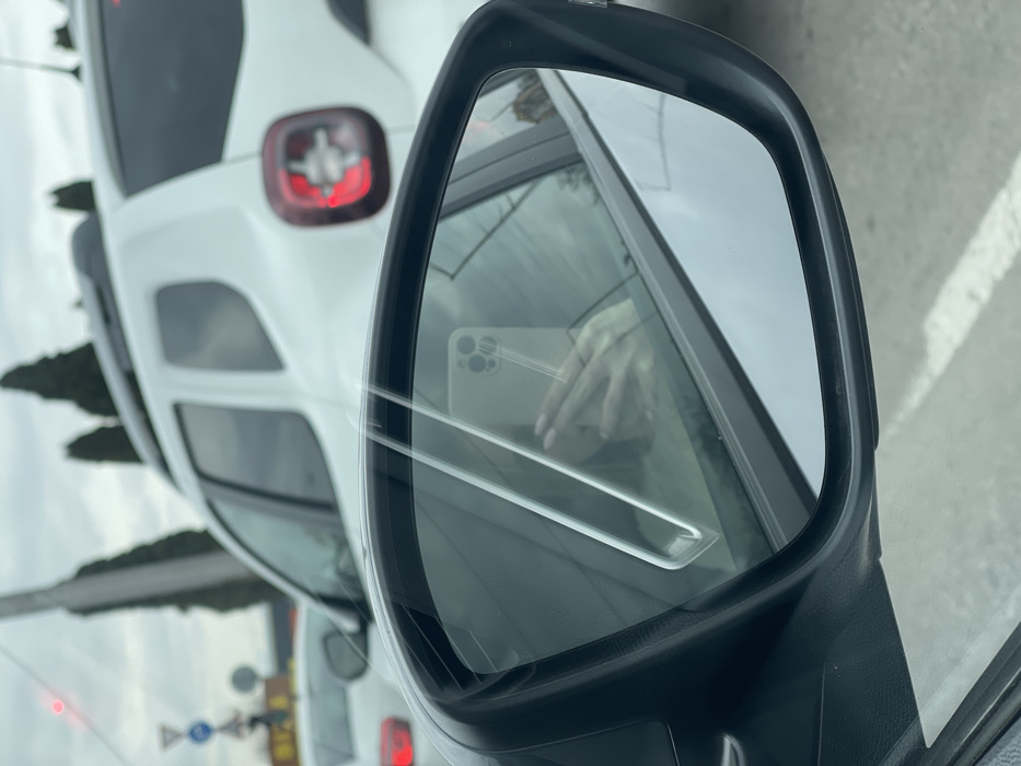 The image depicts an urban street scene in Sofia, Bulgaria, captured from the interior of a stationary or slow-moving vehicle. In the foreground, the black casing and reflective surface of the vehicle's passenger-side exterior mirror are visible. The mirror's reflection shows a light-skinned hand, featuring light pink nail polish, holding a light-colored smartphone. The smartphone is oriented vertically and displays a triple-lens camera array on its rear, consistent with an iPhone Pro model. The reflection also faintly includes a portion of the person's arm or upper body. Beyond the mirror and through the passenger-side window, a white Dacia Duster SUV occupies the midground, positioned directly ahead and slightly to the right of the observer's vehicle. The SUV's rear driver-side quarter panel is visible, with its distinct rectangular taillight illuminated in red. Black roof rails are visible on the SUV's roof. Behind the white Duster, a second, partially obscured vehicle is visible, also displaying an illuminated red taillight. The background consists of an overcast sky. Several dark green, conical evergreen trees are visible against the sky, behind the white SUV. A utility pole or street light pole rises vertically behind the trees. Further left in the background, out of focus, European road signs are present: a blue circular mandatory instruction sign and a red triangular warning sign. Faint white road markings are discernible on the asphalt beneath the mirror. The scene indicates vehicles in traffic.