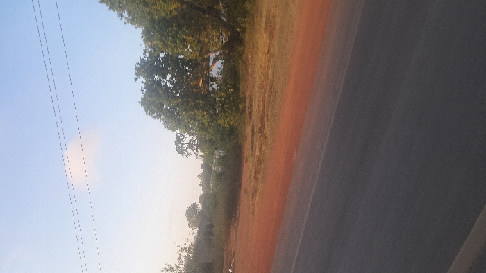 A sideways view shows a black asphalt road on the right, bordered by a reddish-brown shoulder. Trees and vegetation line the edge of the shoulder, transitioning to a sky with faint power lines on the left. The scene appears to be bathed in the soft light of early morning or late afternoon. The vegetation is lush with a variety of green hues. A somewhat hazy atmosphere obscures details in the distance.