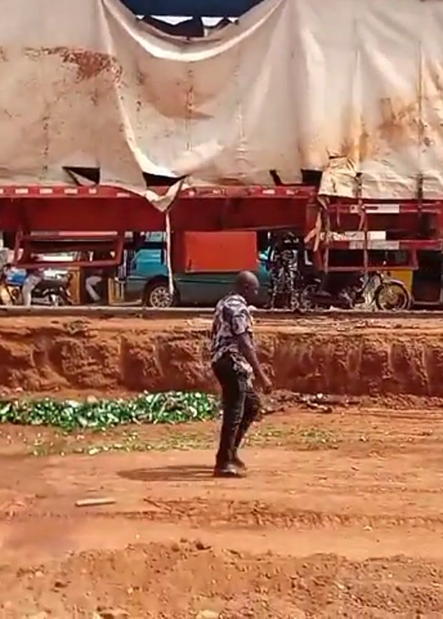 large semi-truck with a covered trailer stuck on a mound of dirt, partially blocking what appears to be a dirt road. There are people milling around, some looking at the truck. Several motorcycles and cars are also present, suggesting some traffic congestion. The environment is dry and dusty with a few buildings visible in the background.