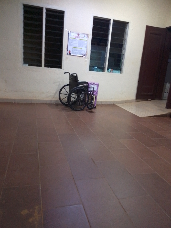This image depicts an interior scene in Nibo, Nigeria. The floor is covered with brown rectangular tiles arranged in a staggered pattern, showing minor scuff marks. The walls are light-colored, exhibiting some discoloration near the base. Two windows with horizontal dark bars are visible on the far wall. Between these windows, a white poster with red text and graphics is affixed to the wall. An unoccupied black manual wheelchair is positioned in the mid-ground, slightly left of center. Adjacent to the wheelchair on its right is a purple rectangular object, possibly a package, with white markings. On the right side of the frame, a dark brown wooden door is partially visible, with a slight ramp leading to its threshold. The overall lighting is dim. No individuals are present in the scene.