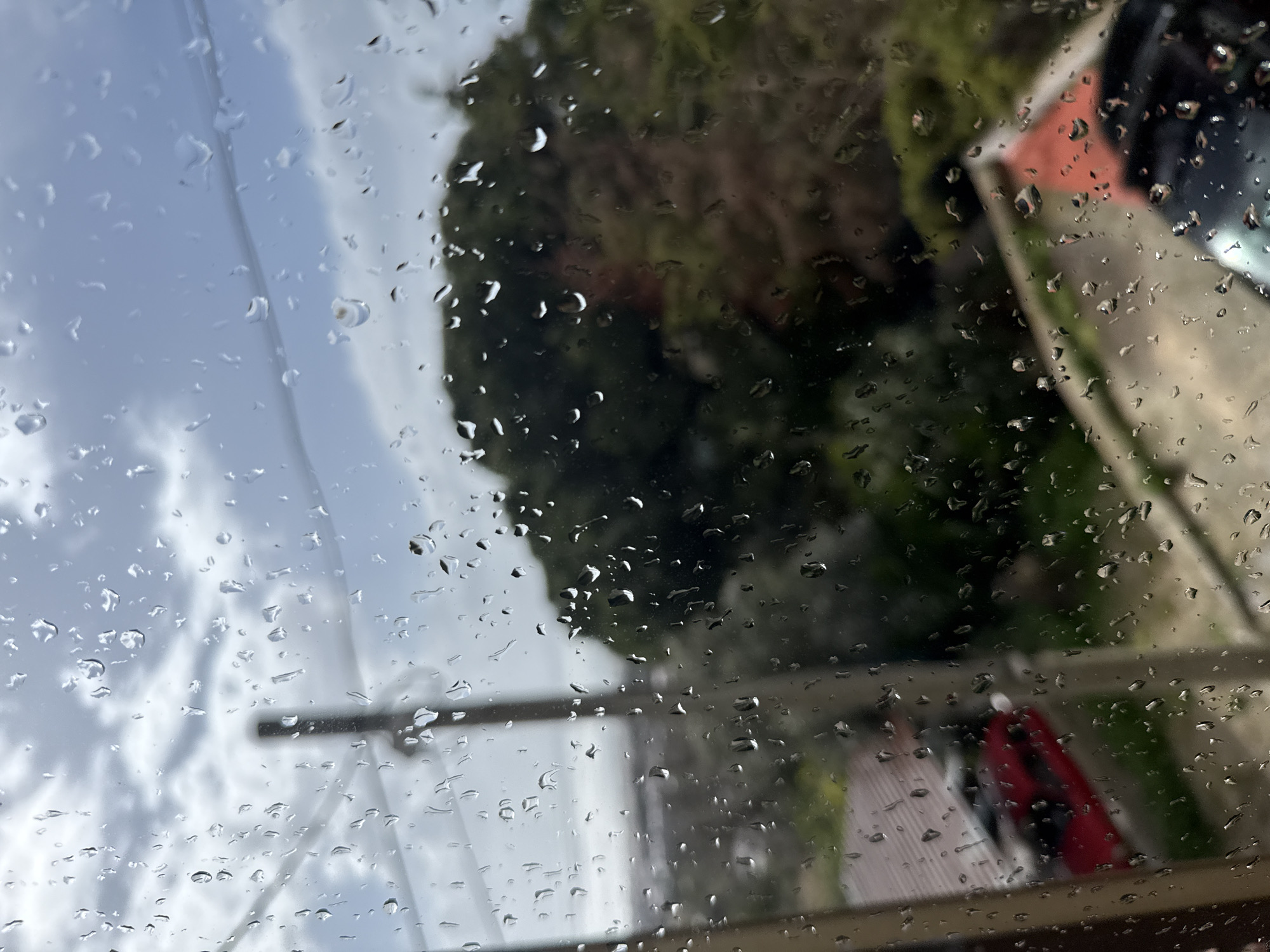 The image displays an outdoor scene through a translucent surface, likely a window, densely covered with various sizes of water droplets