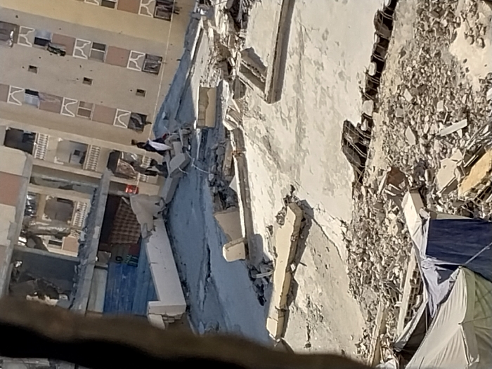 The image depicts a devastated urban landscape in the city of Khan Yunis, Palestinian Territory, showing extensive structural damage under daylight conditions, viewed from an elevated perspective. In the background, a multi-story, light-colored building stands partially destroyed. It exhibits a distinctive pattern of decorative elements or window frames resembling 'M' or 'W' shapes. Numerous windows are either empty, shattered, or show visible damage, with some interiors exposed. A significant section of the building's left side appears to be missing or collapsed. To the immediate left of this building, remnants of another severely damaged structure are visible, characterized by exposed rebar and fragmented concrete. The mid-ground is dominated by a large, cracked, and uneven concrete slab, part of a collapsed or heavily damaged structure. On this slab, two individuals are present. One person, dressed in dark clothing, is positioned on the left side of the slab near a red bucket and a large, light-colored sheet draped over debris. The second person, also in dark clothing, is further to the right on the same slab, with a white object or garment visible near them. Their exact actions are not discernible beyond their presence on the damaged surface. The foreground and lower mid-ground consist of a dense field of rubble, comprising shattered concrete, twisted rebar, broken masonry, and dirt, indicative of a severe collapse. In the lower left corner, a makeshift shelter or tent-like structure, constructed from light-colored fabric and blue tarpaulin, is partially visible amidst the debris. A large, dark, out-of-focus vertical object partially obstructs the view along the left edge of the image.