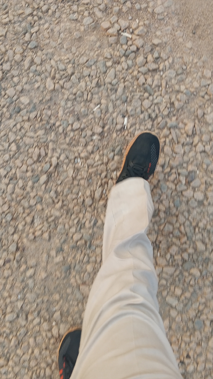 A first-person perspective of a person walking on a gravel path. The individual wears tan-colored pants and black athletic shoes with visible orange accents. The ground consists of small, irregularly shaped rocks and pebbles. The image is somewhat blurred, suggesting motion.