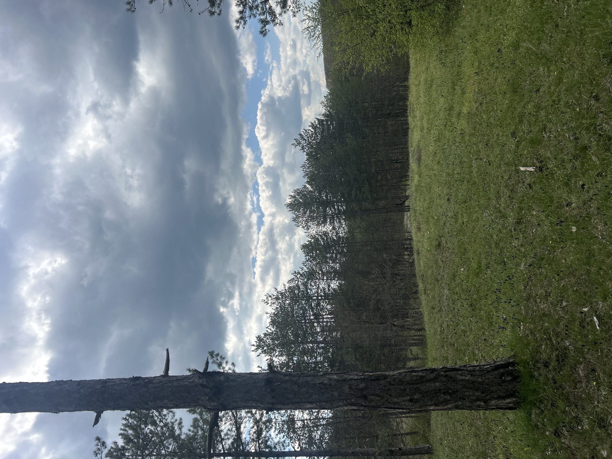 The image depicts a forest scene. A tall tree trunk is in the foreground. Behind it, there is a line of trees separating a grassy area from a darker forest. The sky is filled with dramatic clouds. There is no evidence to suggest this photo was taken in the city of Loznitsa, Bulgaria.