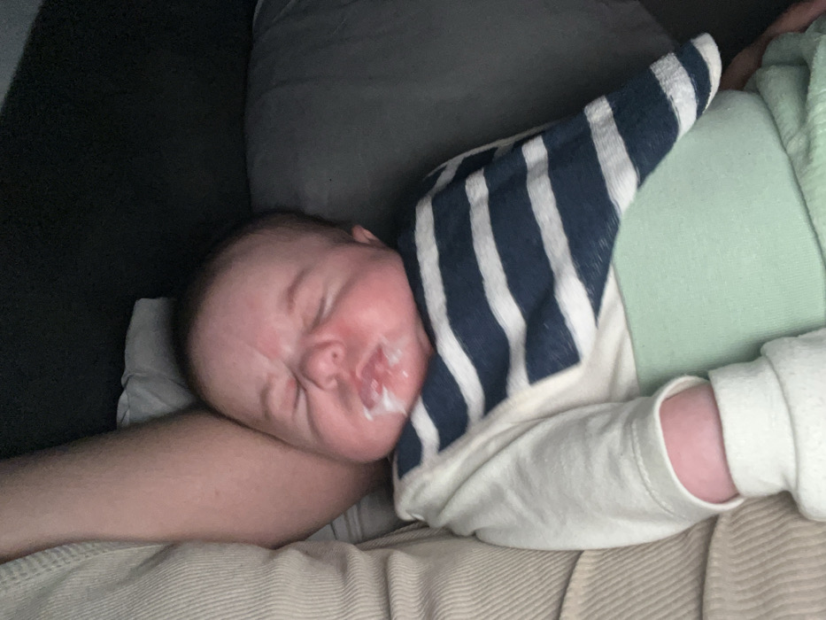 An infant is depicted in a close-up, top-down view, positioned on an adult's arm and torso, presumably in an indoor setting. The infant, with eyes closed and facial features scrunched, has a significant amount of white, liquid residue (consistent with regurgitated milk) on its upper lip, philtrum, chin, and extending onto its bib. The infant wears a cream-colored long-sleeved garment, a blue and white striped bib, and a light green garment beneath. A portion of an adult's arm, clothed in a ribbed, light-colored fabric, supports the infant on the left side of the frame. The background is dark grey/black, suggesting dim lighting or dark soft furnishings. The specific location within Frankfurt, Germany, cannot be determined from the visual information provided in the image.