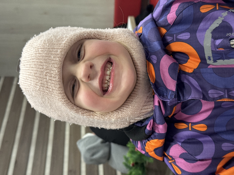 A close-up indoor portrait depicts a young child, appearing joyful, situated in the city of Apatity, Russia. The child, with fair skin and flushed cheeks, smiles broadly, revealing a full set of primary teeth, with eyes squinted in expression. She wears a light beige knitted balaclava-style hat covering her head, ears, and neck. Over an unseen inner layer, she wears a winter jacket featuring a vibrant pattern of large purple, pink, and orange circular and oval shapes on a dark blue background; a partial brand name "JOOOR" is visible. In the out-of-focus background, a blurry figure wearing a grey hooded garment is visible behind the child's left shoulder. To the left, horizontal light and dark brown stripes (possibly wooden paneling or blinds) are present, with a small section of green foliage and red berries below. To the right, a blurred red object, potentially furniture upholstery, and a dark surface are discernible. The lighting appears to be interior artificial illumination.