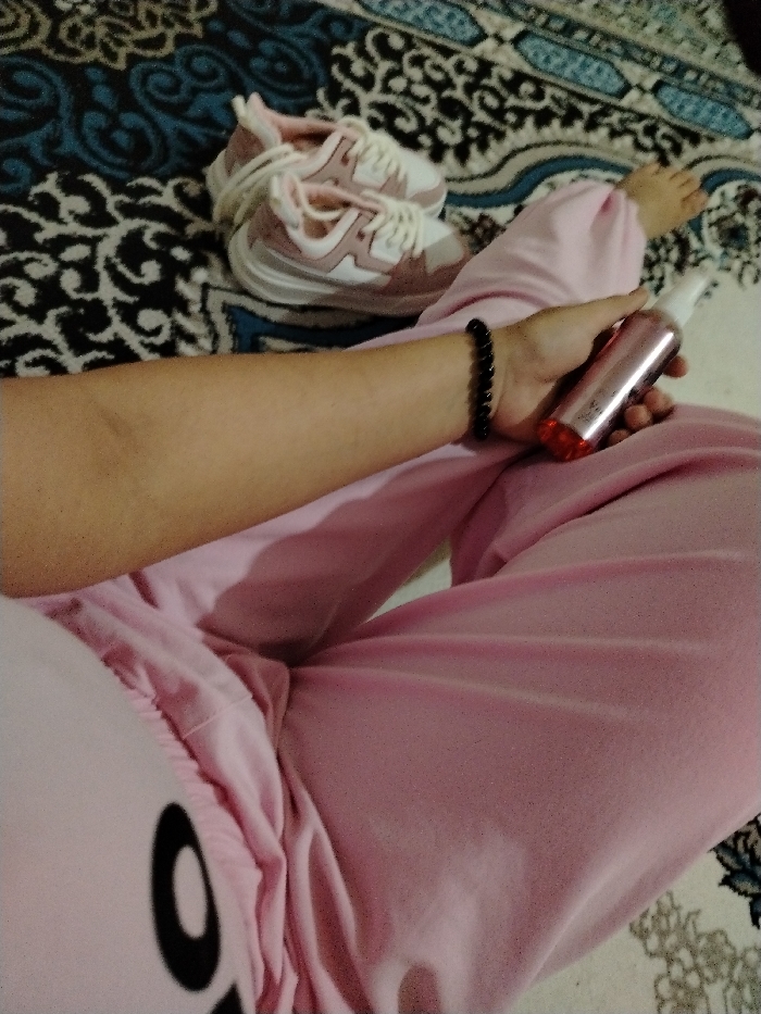 The image depicts an indoor scene in an unidentified location within Navoiy City, Uzbekistan. A person is partially visible from a first-person perspective, showcasing a right arm, lap, and a bare left foot. The individual wears light pink athletic-style pants. The right arm, adorned with a black beaded bracelet on the wrist, holds a metallic pink spray bottle with a white nozzle and a translucent red bottom. To the left of the person's lap, a pair of light pink and white athletic sneakers with thick white soles and white laces rests on a patterned floor covering. The floor covering features a complex design with large black and white patterns on a dark ground, interspersed with blue and white floral or geometric motifs.