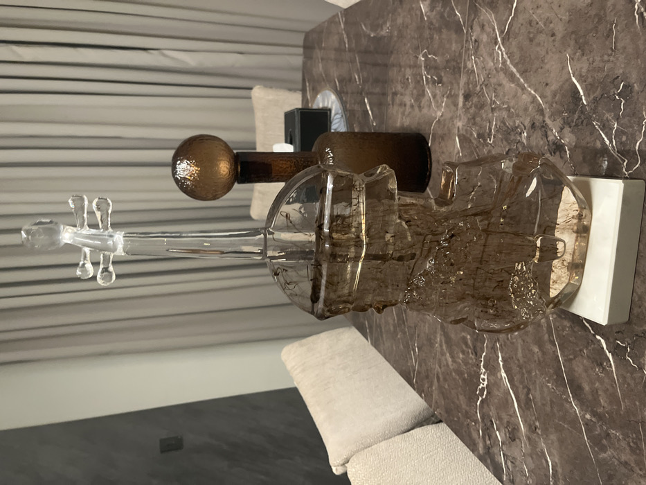 The scene depicts an interior setting within the city of Gwarinpa, Nigeria, specifically a room furnished with a large table and seating. In the foreground, centered on a dark brown or gray marble table with prominent white veining, stands a transparent glass sculpture shaped like a violin. This sculpture is amber-tinted, with a clear glass neck and scroll-like tuning pegs, and rests on a white rectangular base. Within the body of the glass violin, dark, thin, filament-like inclusions are visible. To the right and slightly behind the violin sculpture, another decorative object is present on the table: a tall, dark amber-brown textured glass bottle topped with a spherical, textured amber-brown glass orb. A black rectangular object, possibly a tissue box, is partially visible behind this second sculpture. To the left, a light beige, textured upholstered dining chair is positioned against the table. Further to the left, a portion of another identical chair is visible. The background features light-colored, possibly off-white or light grey, pleated curtains covering a wall or window. A dark grey or black accent wall is partially visible on the far left. The environment appears to be an indoor space, possibly a dining area or living room, illuminated by artificial light. No individuals or active interactions are present in the image.