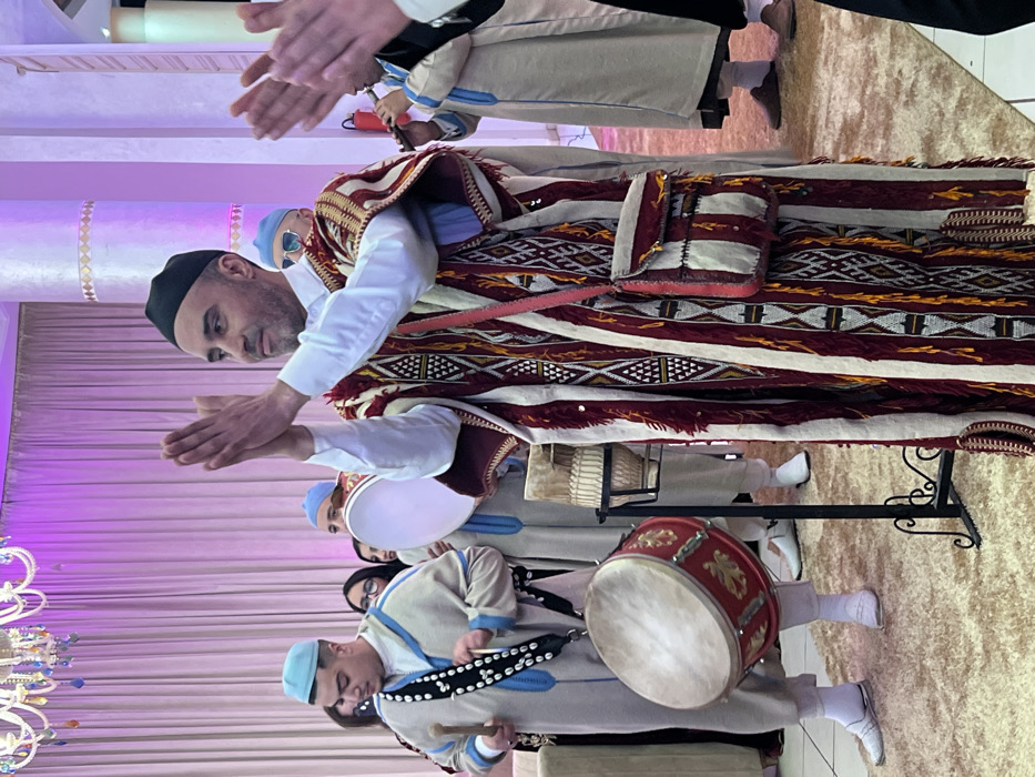 Men in traditional Moroccan attire perform music. One man claps while wearing a patterned robe and a black hat. Others wear blue caps and play drums. The group stands on a beige carpet indoors. A chandelier and pinkish-purple drapes provide a backdrop. The men's clothing features embroidery and ornamentation.
