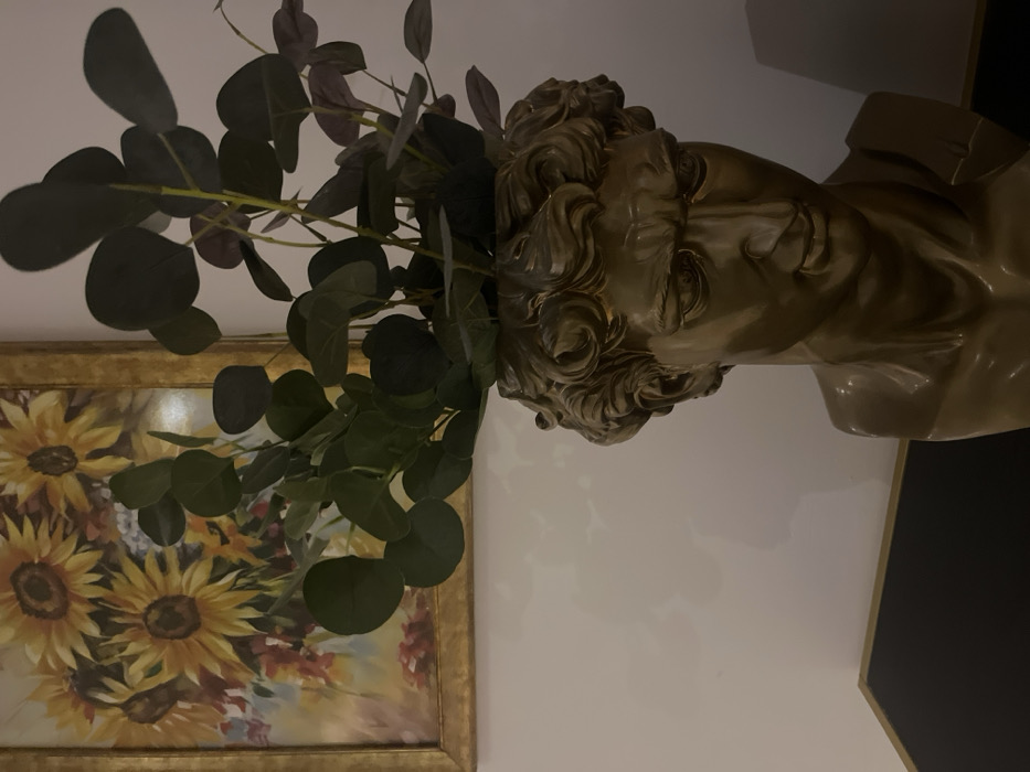 This image depicts an interior scene in Saint Paul's Bay, Malta. In the foreground, a golden-bronze colored bust, stylized after Michelangelo's David, functions as a planter. A cluster of green foliage, consistent with eucalyptus, emerges from the top of the bust. The bust rests on a dark, flat surface with a thin golden edge. In the background, to the left, a rectangular painting hangs on a light-colored wall. The painting is enclosed in an ornate golden frame and features a floral composition primarily of yellow sunflowers. The scene is illuminated by soft, ambient lighting, casting subtle shadows on the wall.