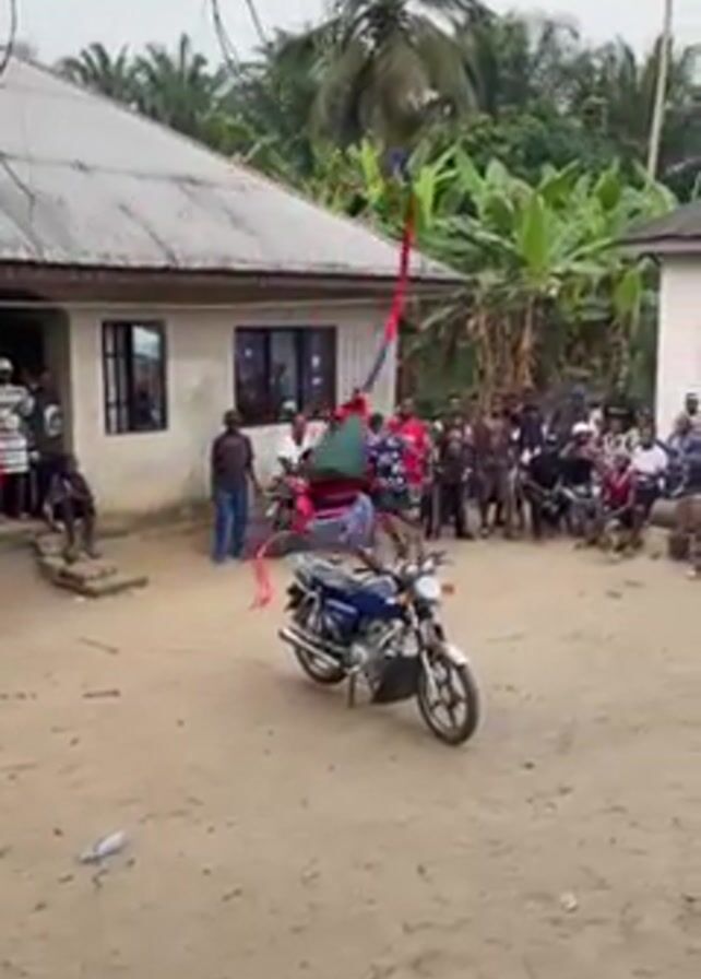 A small, outdoor gathering is taking place in a rural setting with a dirt ground. The main focus is on a figure in a traditional costume dancing in the center of the gathering. The dancer has a colorful headdress and appears to be performing energetically. A small crowd of people, including children, are watching from around a motorbike and the steps of two small houses. Some of the spectators are clapping and appear to be enjoying the performance. The weather looks overcast. There are lush trees and vegetation in the background.