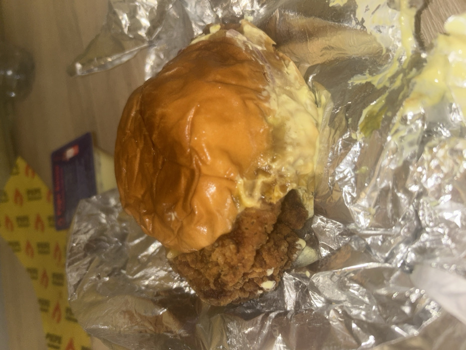 - "A fried chicken sandwich, partially unwrapped from crumpled silver aluminum foil, rests on a light wooden surface" by FM-RlwBp1, licensed under CC BY 4.0