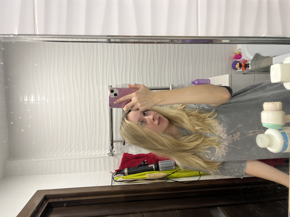 The image depicts a mirror selfie taken by a young adult female in a bathroom located in Baranavichy, Belarus. The female, with long, light blonde hair, is wearing a light gray t-shirt featuring a faded graphic of a winged skeletal figure. She holds a pink smartphone with a patterned case in her right hand, angled towards the mirror to capture the reflection. Her gaze is directed towards the phone's camera. The bathroom features white, horizontally wavy textured tiles on the walls. A dark brown wooden doorframe is visible on the left. A silver heated towel rail is mounted on the wall to the left of the female. Hanging from hooks or a rail near the door are a black hair dryer/styler with an attached brush head, a yellow towel, and a red towel. A hairbrush is also visible. In the foreground, partially obscured, a white plastic bottle with a blue label and a white facial cleansing brush are visible on a surface. To the right, above a partially visible white bathtub, a small purple bottle (possibly shampoo) is present on a counter. The bathtub's edge displays a small grey towel and several small figures, including one resembling a ninja/samurai and another with pink hair. A white rectangular object, possibly soap, is partially visible in the immediate bottom right foreground.