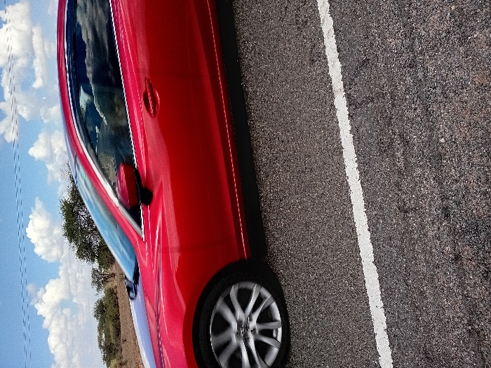 A red car is parked on an asphalt road next to a white line. The car's driver-side door and front wheel are visible. The sky is blue with white clouds. Some trees are in the background. The image is rotated, with the top of the car facing the left side of the image.