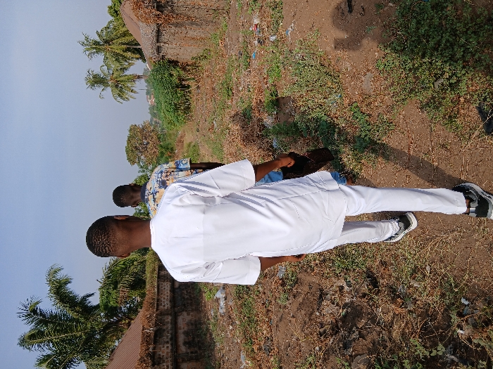 Two men stand outdoors, one in a white outfit with matching pants and the other in a patterned shirt and jeans. They are near a grassy, dirt-covered area with scattered debris and a visible palm tree. The lighting suggests daytime, with shadows cast on the ground. A weathered wall runs along the edge of the scene, and more vegetation is visible in the background.