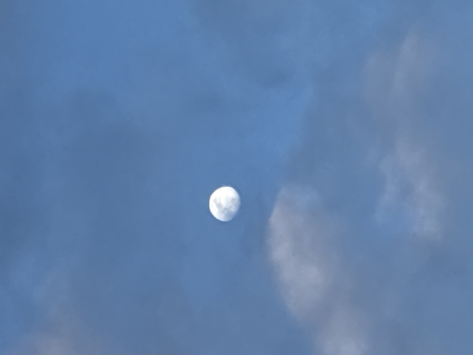 The image displays a brightly illuminated Moon, appearing in a gibbous phase with visible topographical features, set against a predominantly clear blue sky. The Moon is positioned in the upper-central left section of the frame. Scattered, diffuse white and light grey clouds are present, primarily in the lower-central and lower-left quadrants, partially obscuring the blue sky. The environment indicates daytime or twilight conditions. No people, discernible actions, or direct interactions are visible within the frame. This scene is located in Munin, Syria.