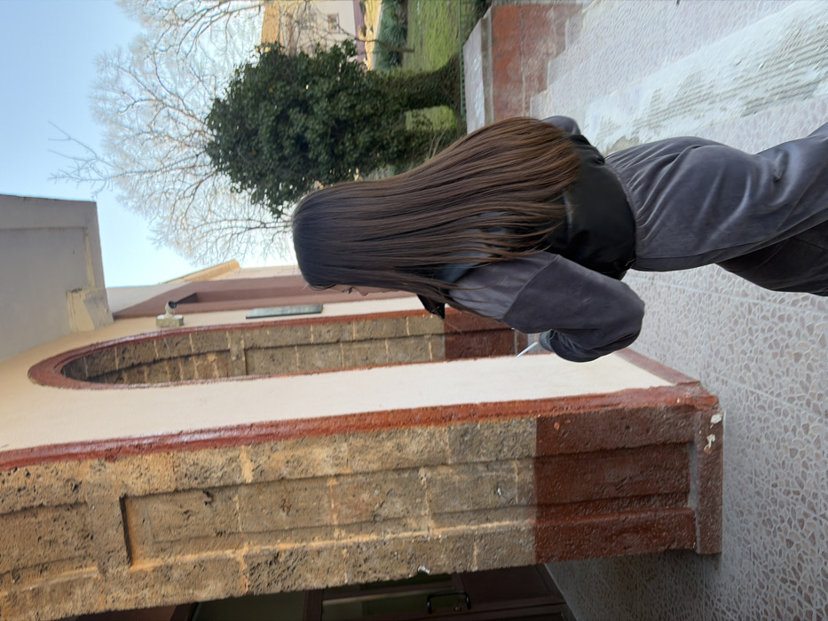 A forensic description of the scene depicts an outdoor environment in Cherven Bryag, Bulgaria, on a clear day. A single individual, a female with long, straight, dark brown hair, is captured from the right side and slightly behind, walking towards the right of the frame. She is wearing a dark gray velvet tracksuit with a matching top and bottom, overlaid with a black cropped puffer vest. Her left hand holds a white rectangular object, possibly a mobile phone. The subject is positioned on a light-colored tiled walkway, which exhibits a mosaic or mottled pattern, with steps descending towards the right foreground. To the left, a building with a pale cream or light yellow facade features a large arched recess, framed by a prominent dark reddish-brown border. The lower section of the building's wall is banded with a similar reddish-brown hue. The wall construction incorporates rough-hewn, irregular stone blocks. A security camera, small and white, is mounted above the archway. A brown-framed door with glass panels is partially visible on the far left. Beyond the paved area, a grassy lawn extends into the background. Several trees are present; some are deciduous with bare branches, while a dense, dark green evergreen tree stands prominently in the mid-ground. Another light-colored building is partially visible in the far background on the right. The sky overhead is clear and blue.